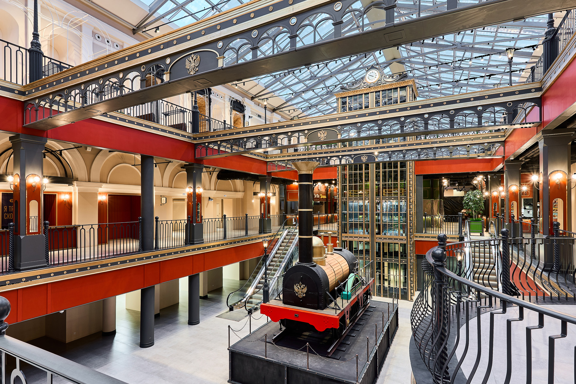 Во-первых, отметим, что пространство фудмолла отправляет гостей в настоящее путешествие сквозь время. Здание оформлено в индустриальном стиле, который подчеркивает его историю. В дизайне подчеркнуты открытые кирпичные стены, массивные металлические конструкции, также есть элементы, присущие вокзалам.
