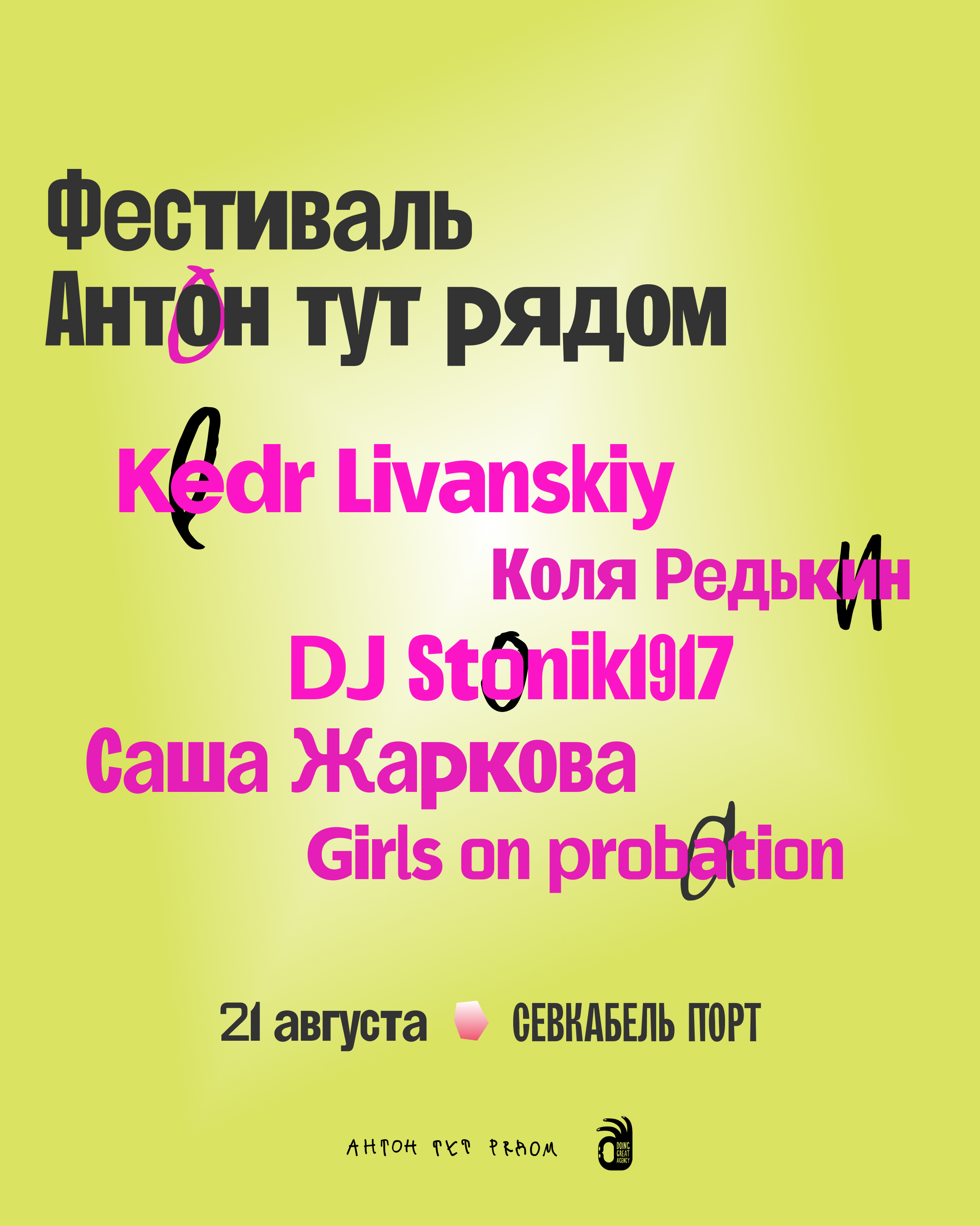 Музыкальный благотворительный фестиваль «Антон тут рядом», который состоится 21 августа в Севкабель Порту, впервые анонсировал DJ-сцену. К уже объявленным ранее музыкантам присоединяются диджеи: Kedr Livanskiy, Коля Редькин, DJ Stonik1917, Саша Жаркова и Girls on probation.