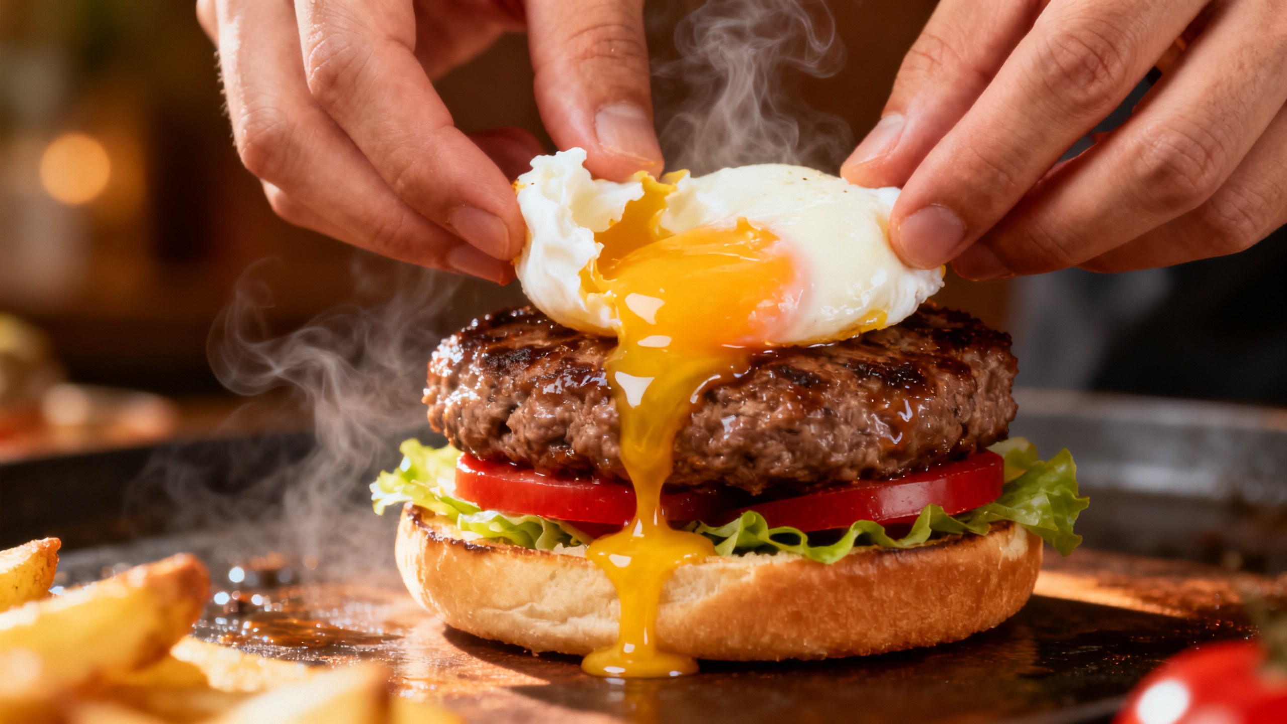 Пошаговый рецепт домашнего бургера с говядиной, яйцом пашот и фирменным соусом. Узнайте, как собрать сочный бургер, который удивит близких и станет хитом семейного ужина.