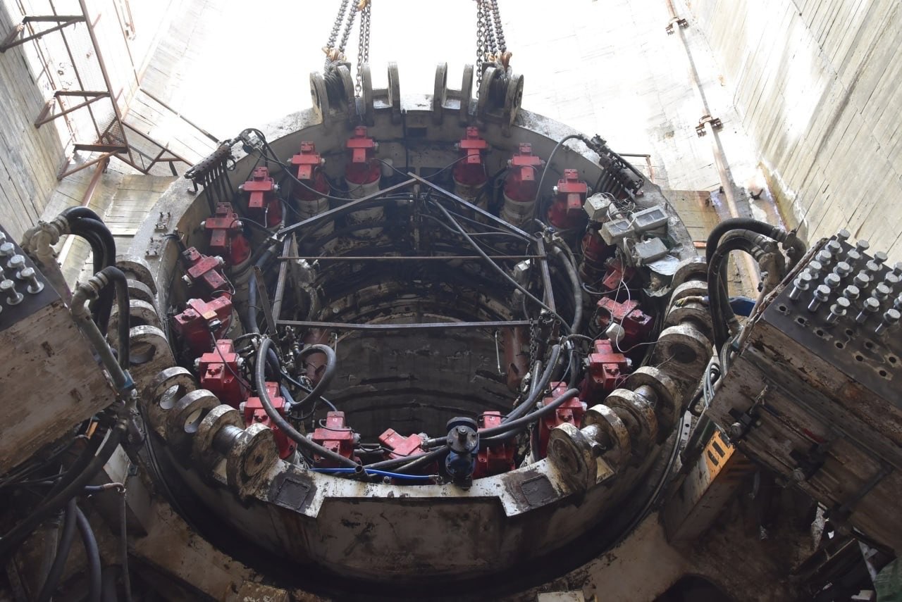 «С ювелирной точностью 160-тонный механизм состыковали с другими сегментами тоннелепроходческого комплекса. Глубина, на которую оператор портального крана опускал груз, – около 30 метров», – говорится в сообщении пресс-службы.
