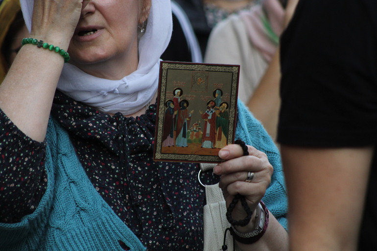 Пока первые ряды шествия двигались под звон колоколов и с иконами, в середине колонны звучали патриотические лозунги. Маленький мальчик с энтузиазмом выкрикивал религиозные приветствия, а батюшка из одной из групп напоминал, что церковь не занимается политикой. Это звучало особенно необычно на фоне недавних обсуждений в соцсетях, где подобные шествия сравнивали с националистическими акциями.