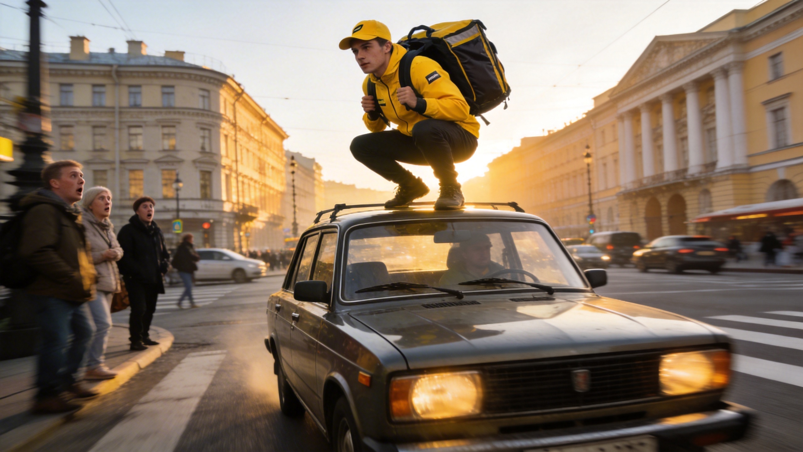 Утро 20 марта на Васильевском острове запомнится многим жителям Петербурга. На пересечении Малого проспекта В.О. и Наличной улицы прохожие стали свидетелями крайне необычной картины: курьер Яндекса, облаченный в фирменную форму и с рюкзаком за спиной, ехал не внутри автомобиля, а прямо на крыше «Жигулей». По данным Петербург2, видео с этим эпизодом быстро разошлось по городским телеграм-каналам и вызвало бурное обсуждение среди пользователей.