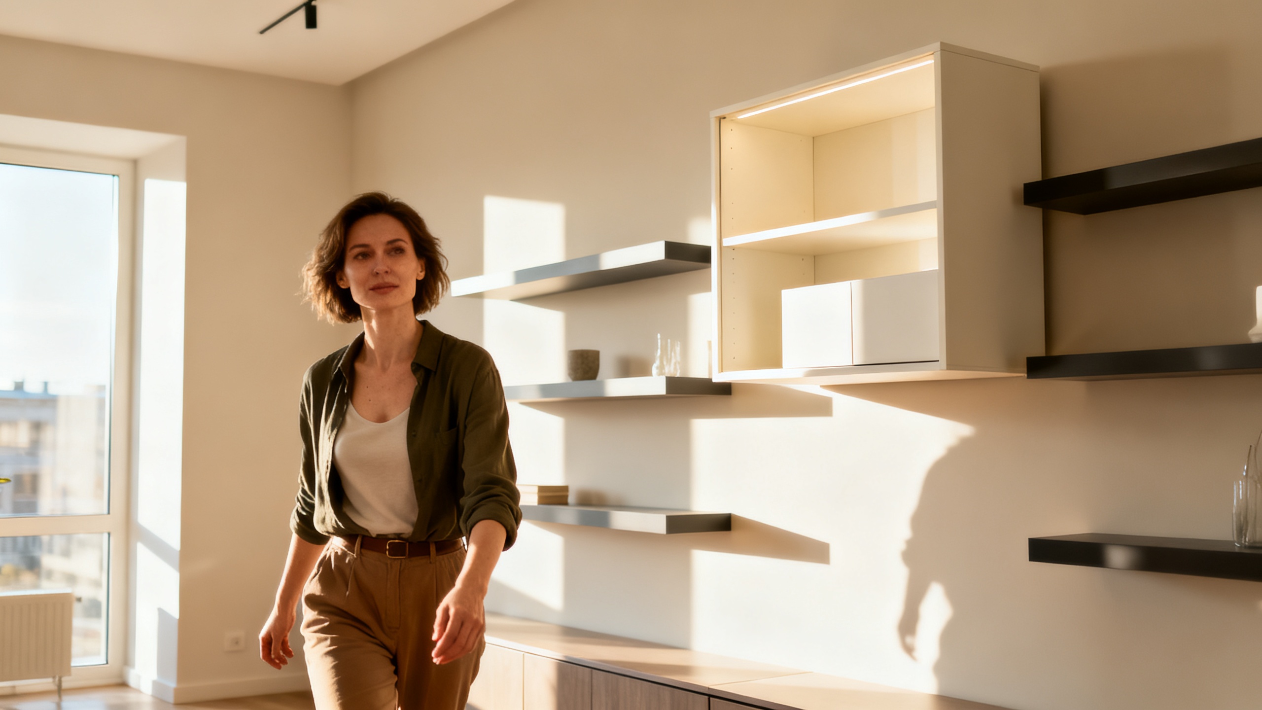 Если вы планируете обновление интерьера, обратите акцент на модульные рельсовые системы для гостиной и спальни - они дешевле и современнее привычных «стенок». На кухне хотя бы один открытый металлический стеллаж добавит воздуха и упростит хранение. Мелкую технику лучше спрятать в пенал или отдельную кладовку. В ванной стоит отказаться от напольной тумбы в пользу подвесной консоли. В каждой комнате используйте вертикальное пространство: стеллажи от пола до потолка визуально поднимают потолки и дают больше места для хранения.