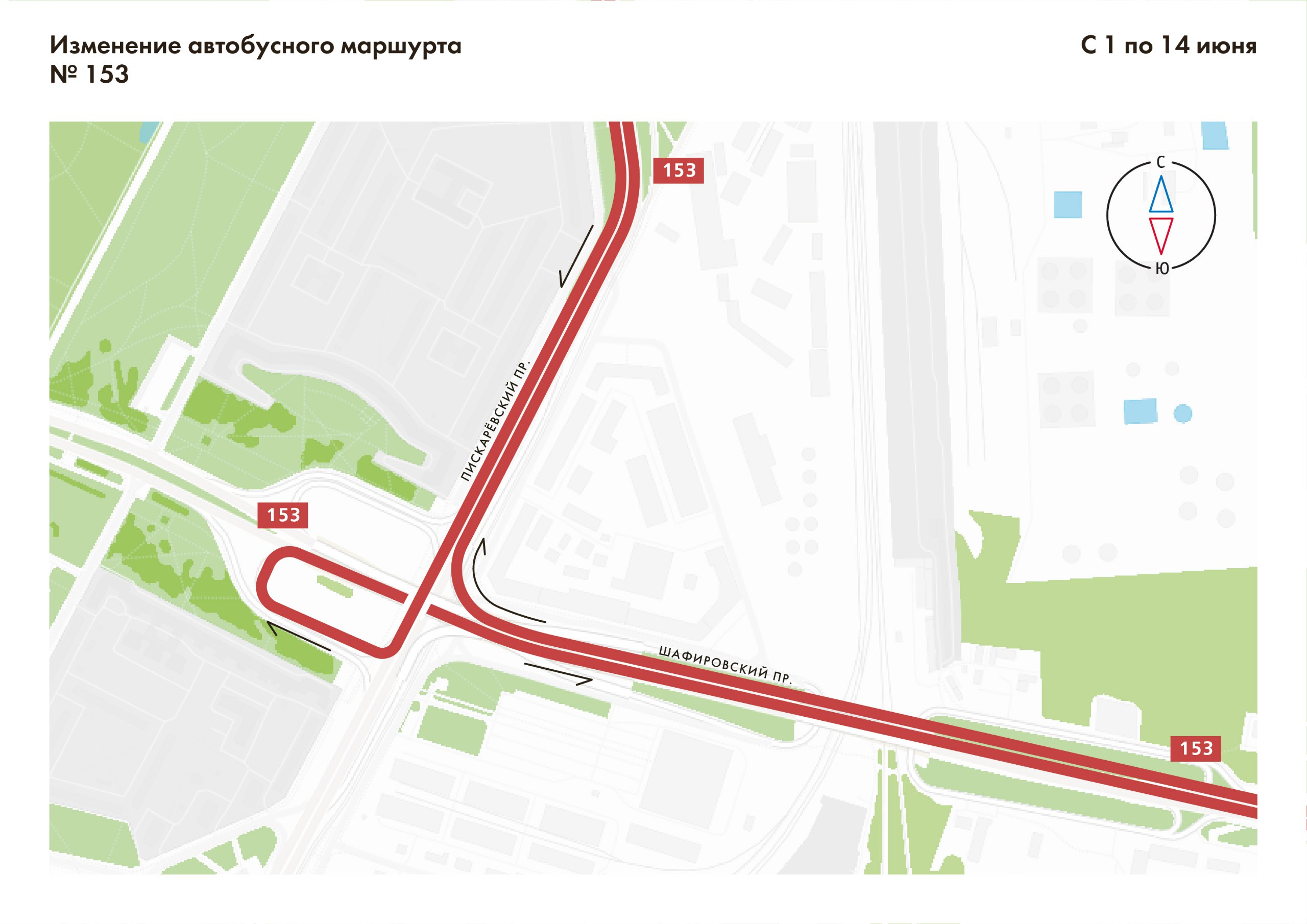 Автобус № 153 будет следовать от конечной остановки «Проспект Культуры» по действующей трассе до Пискаревского проспекта, далее по Пискаревскому проспекту, съезду с Пискаревского проспекта на проспект Непокоренных, проспекту Непокоренных, Шафировскому проспекту и далее по действующей трассе до конечной остановки «Хасанская улица».