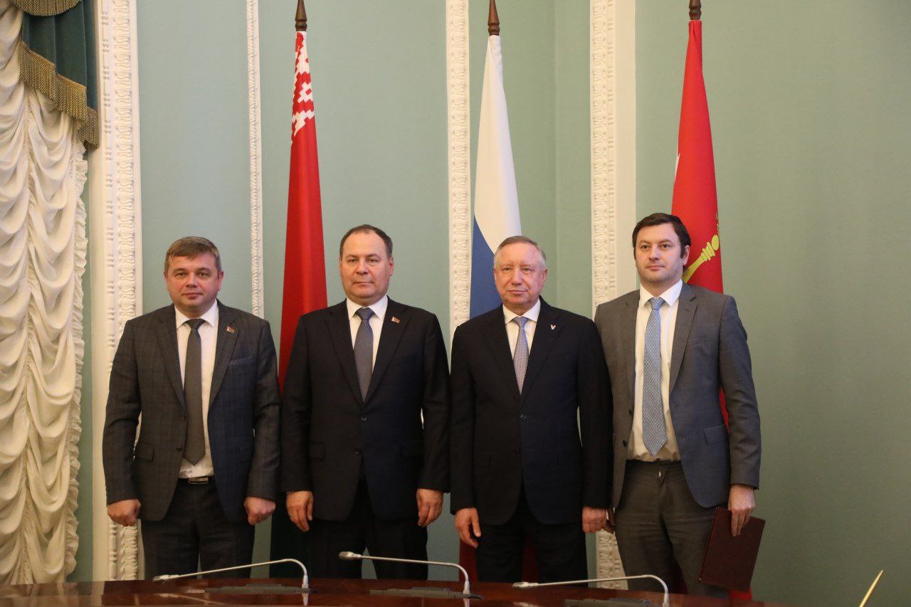 Председатель Комитета по транспорту Валентин Енокаев и заместитель министра промышленности Республики Беларусь Андрей Кузнецов подписали Меморандум о развитии сотрудничества между Северной столицей и Беларусью для обновления подвижного состава общественного транспорта города на Неве. На торжественном моменте присутствовали также Губернатор Петербурга Александр Беглова и премьер-министр Республики Беларусь Роман Головченко.