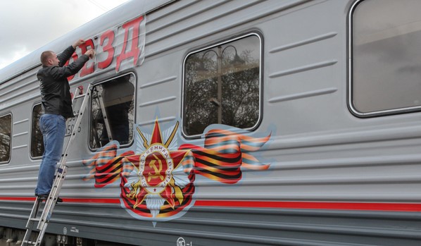 «Поезд Победы» прибыл на Витебский вокзал в Петербурге. Это первая и единственная в мире инсталляция, размещенная в движущемся поезде. Состав состоит из 10 тематических вагонов — каждый из них посвящён отдельным событиям Великой Отечественной войны: блокаде Ленинграда, битве за Москву, Сталинградской битве и Курской дуге.