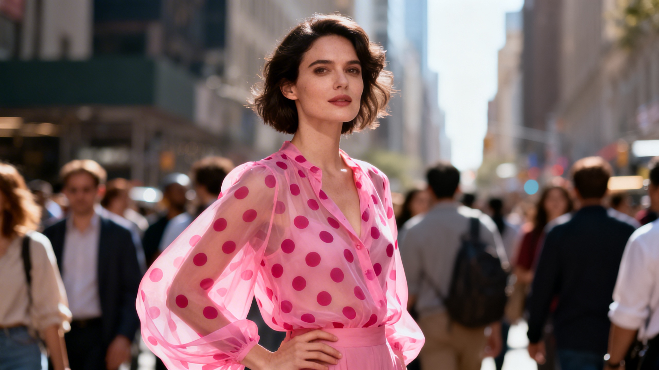 Пятый тренд - блузы в горох. Этот принт остается актуальным и в 2026 году, переходя с платьев и юбок на легкие блузы. Горох добавляет образу игривости и легкости, а современные дизайнеры предлагают носить такие блузы не только с классическими жакетами, но и в самостоятельных комплектах. Принт отлично сочетается с однотонными вещами и позволяет создавать яркие, запоминающиеся образы.