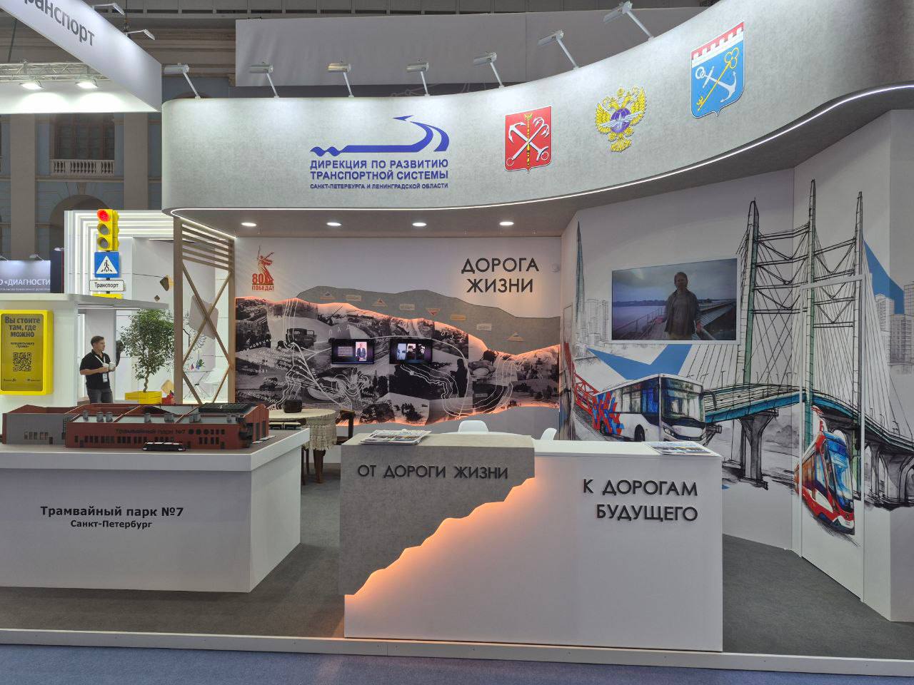 В первой части стенда посетители могли познакомиться с историческими материалами, посвященными легендарной «Дороге жизни». Эта часть экспозиции напоминала о героическом прошлом и значении транспортных маршрутов для развития региона. Однако организаторы не ограничились только ретроспективой: плавный переход к современности был реализован с помощью интерактивных решений и мультимедийных панелей.