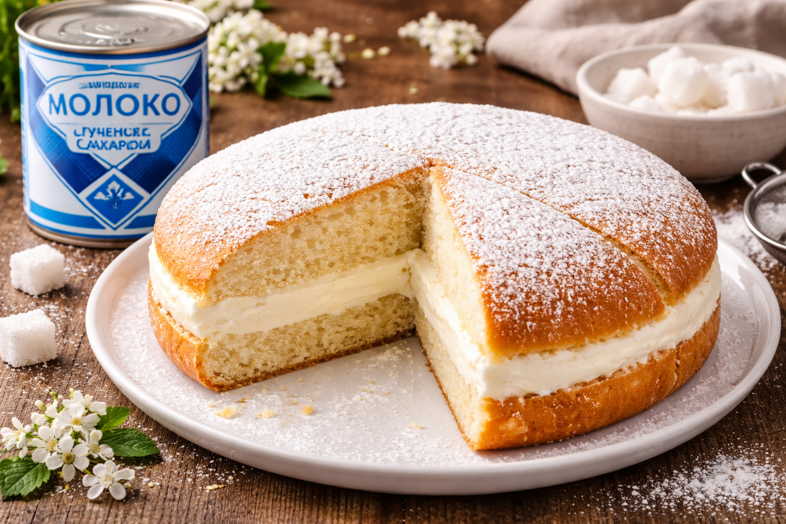 Сборка пирога проста: разрежьте корж на два пласта, нижний щедро пропитайте сиропом, смажьте кремом, накройте вторым коржом, слегка пропитайте его и посыпьте сахарной пудрой. Поставьте пирог в холодильник минимум на час, чтобы он хорошо пропитался и стал еще нежнее.