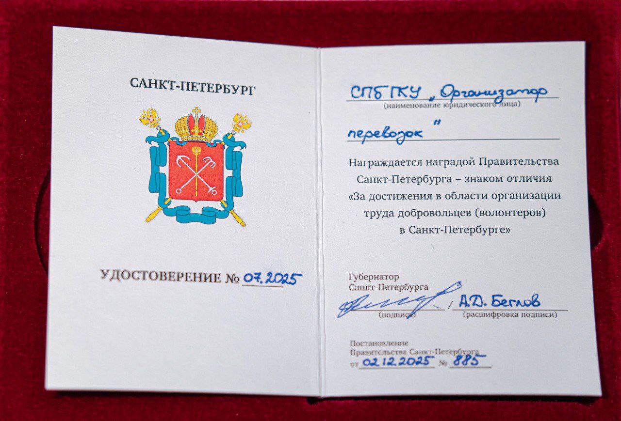 В 2025 году СПб ГКУ «Организатор перевозок» стало обладателем престижной награды Правительства Санкт-Петербурга за выдающиеся успехи в создании условий для добровольческого труда. Как сообщает пресс-служба Комитета по транспорту Санкт-Петербурга, знак отличия был вручен директору учреждения Денису Усанову лично губернатором Александром Бегловым.