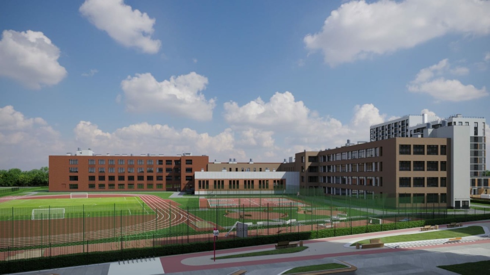 Здесь также построят два спортзала, два бассейна и соляную комнату. Большая спортивная зона предусмотрена и на пришкольной территории.