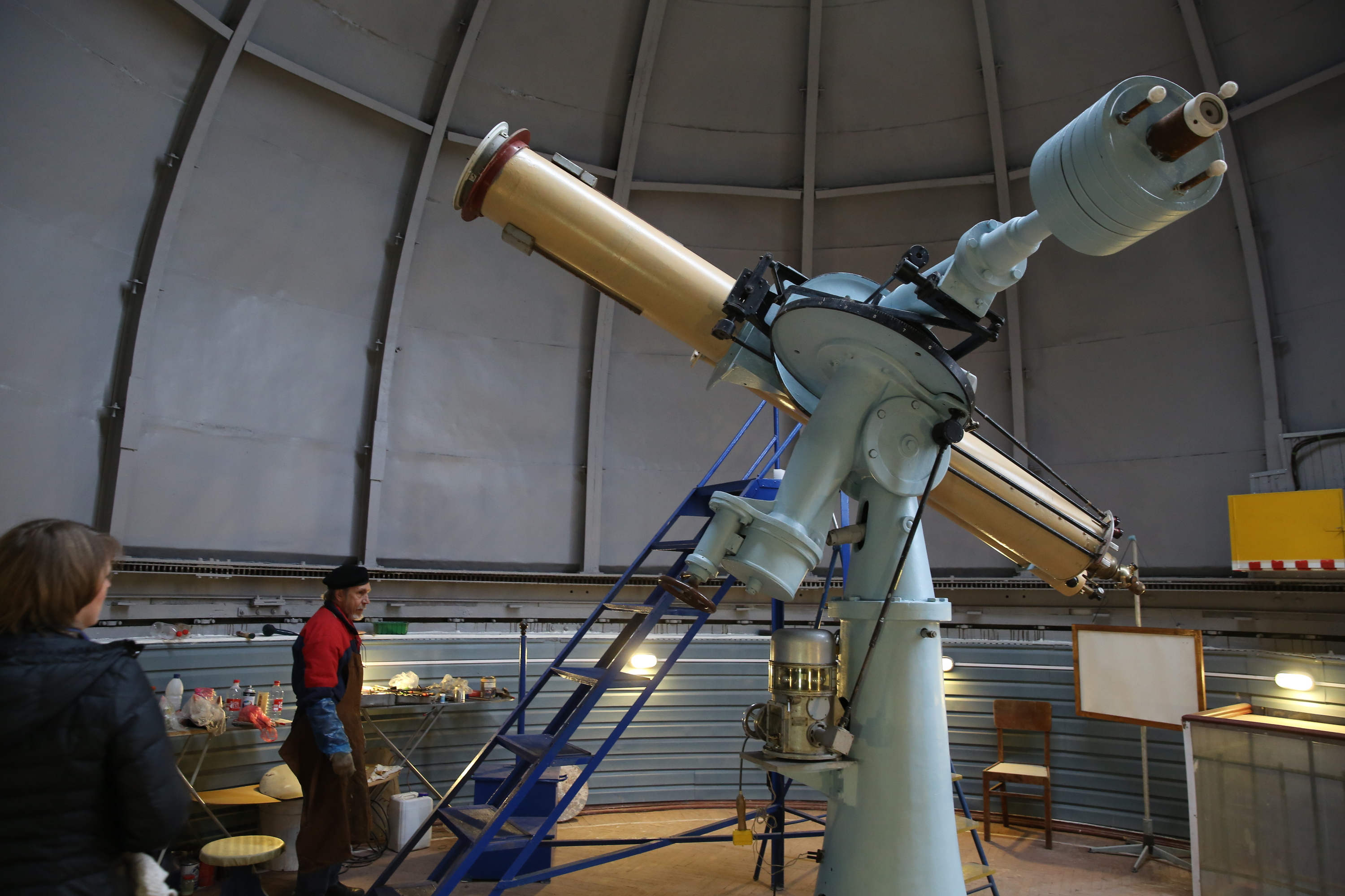 Через полчаса все выходят на улицу, где под красными лампами уже ждут десятки белых телескопов. В каждом из трех залов - по несколько мощных приборов, настроенных на разные объекты: планеты, туманности, остатки сверхновых. Для удобства рядом стоят стремянки - не каждый сможет дотянуться до окуляра без помощи.
