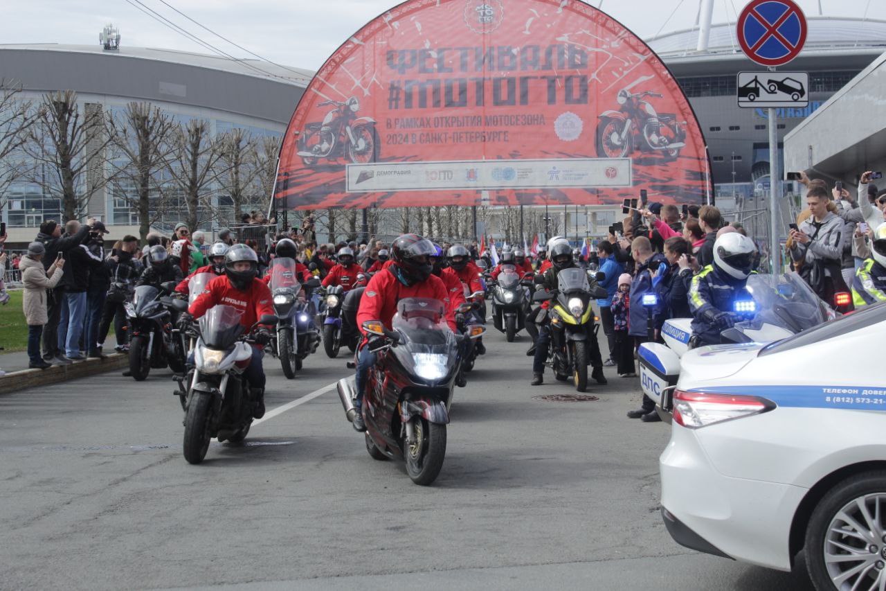 Кульминацией дня стал традиционный мотопарад. По улицам города проехала внушительная колонна из 1 100 мотоциклистов. Впереди двигались флагоносцы с символикой России и Санкт-Петербурга, задавая торжественный тон мероприятию. Зрители приветствовали участников, а многие снимали происходящее на видео, чтобы сохранить воспоминания о ярком событии.
