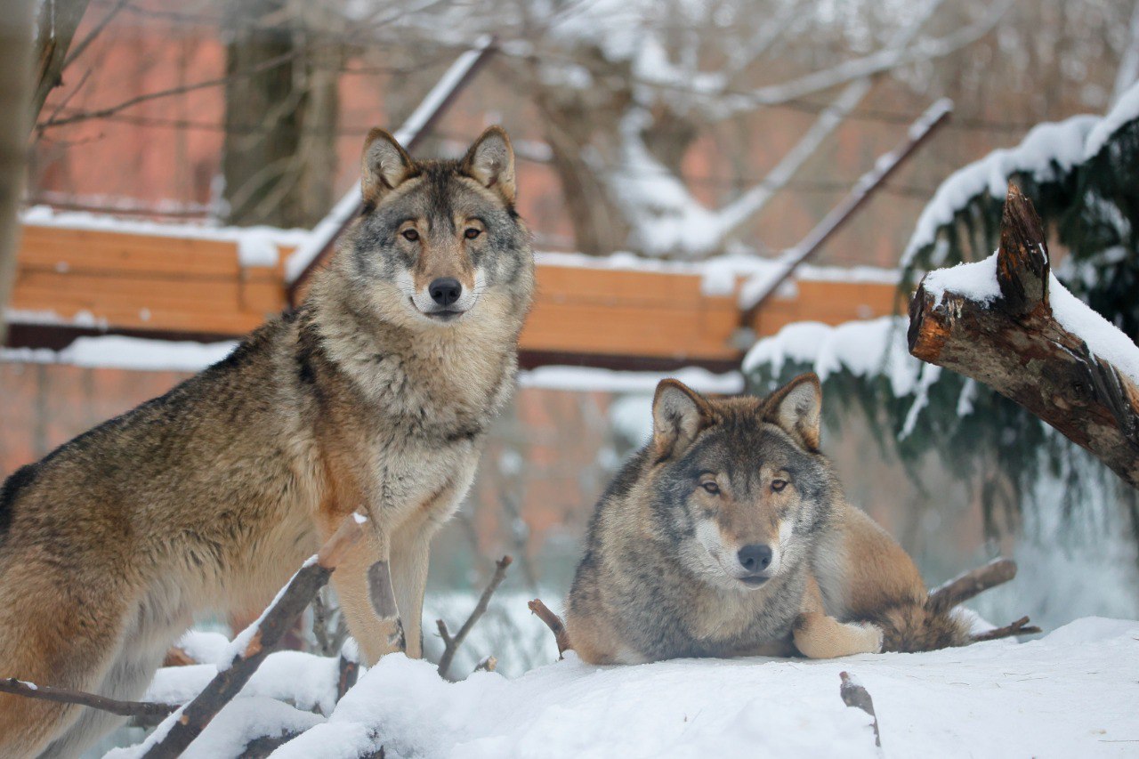 Волки Мрак и Сумрак радуются снегу в Ленинградском зоопарке